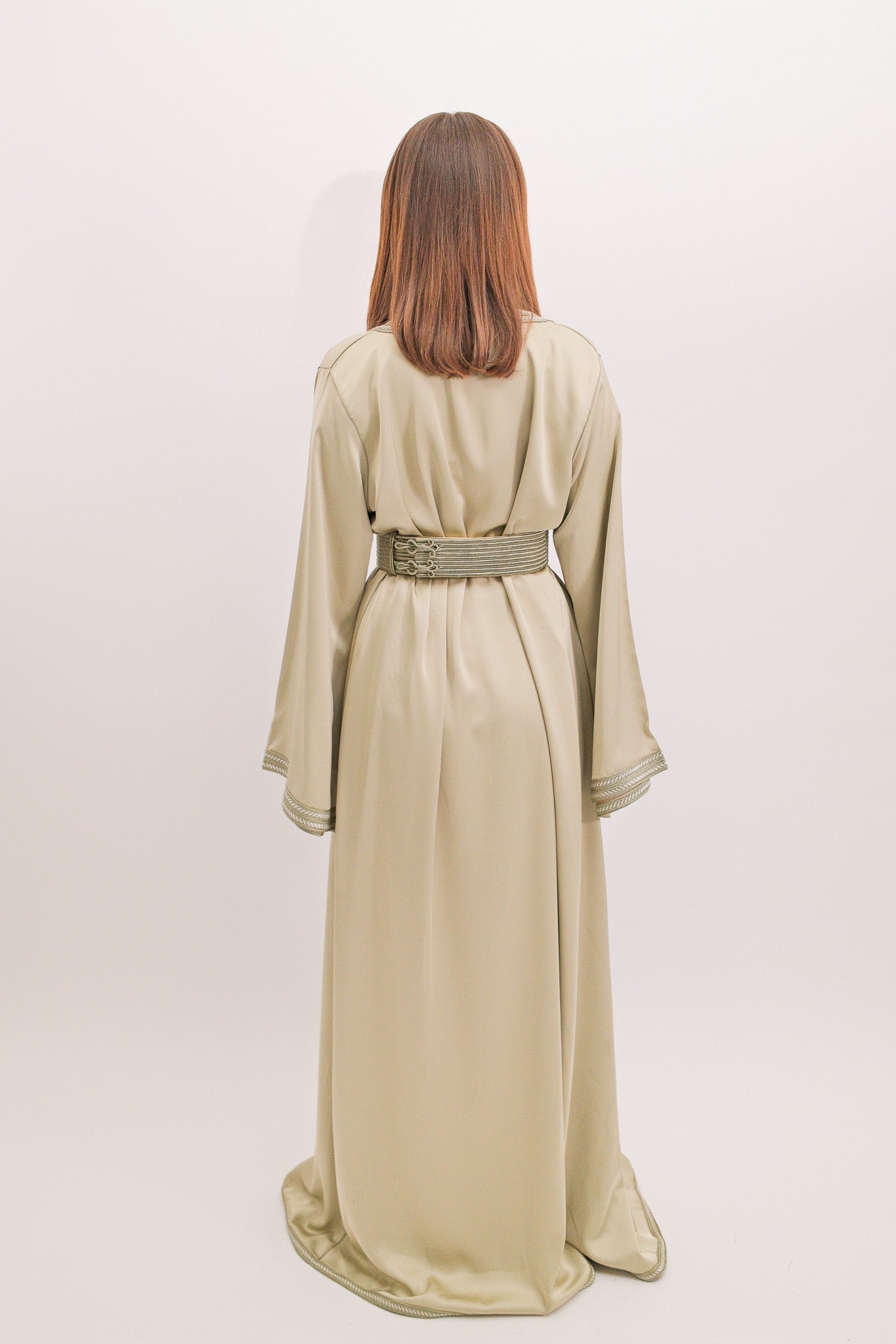Sophistiquée et intemporelle, cette takchita en satin de soie et crêpe de soie de haute qualité séduit par son élégance et sa fluidité. Sa création unique, confectionnée avec un savoir-faire artisanal, offre un tombé parfait et des finitions raffinées. Idéale pour les grandes occasions, elle incarne le mariage parfait entre tradition et modernité.